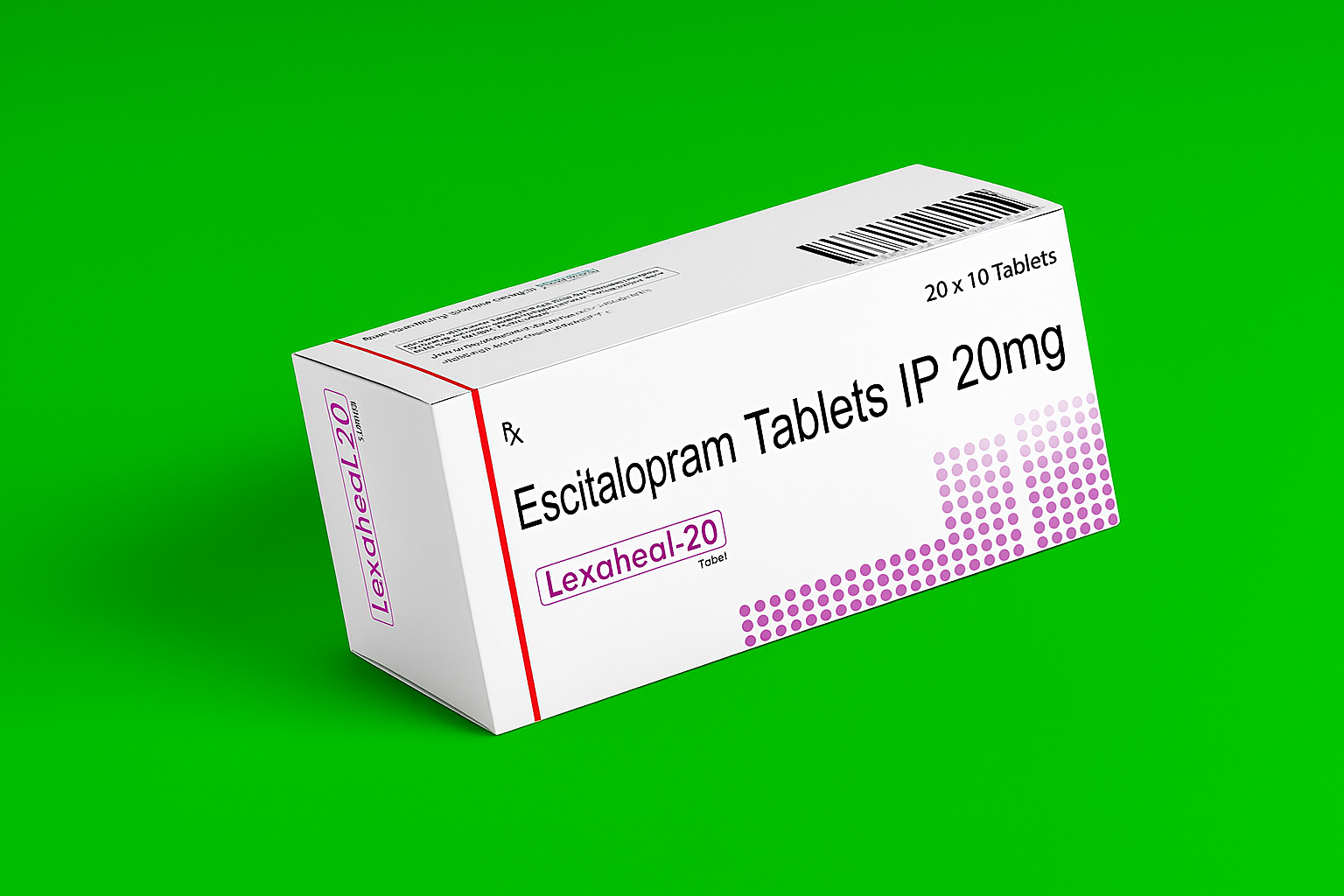 Lexaheal 20 mg contains Escitalopram Oxalate, a selective serotonin reuptake inhibitor (SSRI) used to treat major depressive disorder (MDD) and generalized anxiety disorder (GAD). By increasing serotonin levels in the brain, Lexaheal helps improve mood, emotional balance, and overall mental well being. It is a high strength dose intended for patients requiring enhanced antidepressant support under medical supervision.